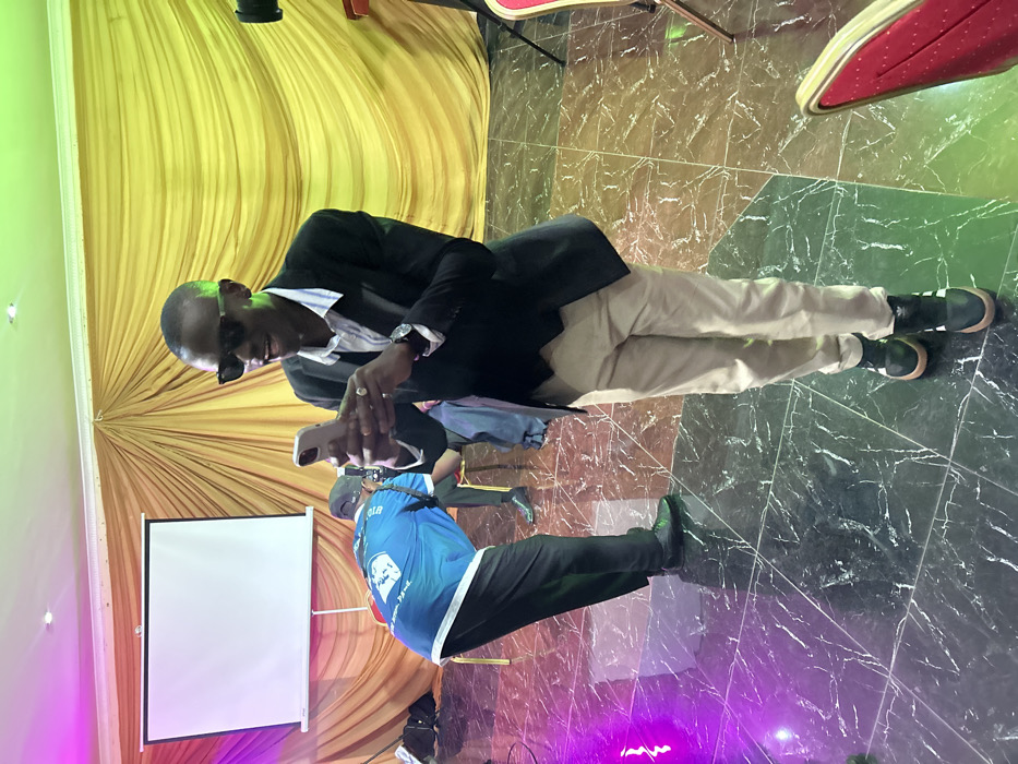 A man in a suit, sunglasses, and light-colored pants stands on a glossy, patterned floor, holding a cell phone. He's facing down, possibly taking a photo. Another person is next to him, wearing a blue shirt and dark pants. A projector screen is visible behind them. A gold curtain forms the background. The lighting is varied, with green and purple hues. A chair leg is also visible on the right side of the frame.