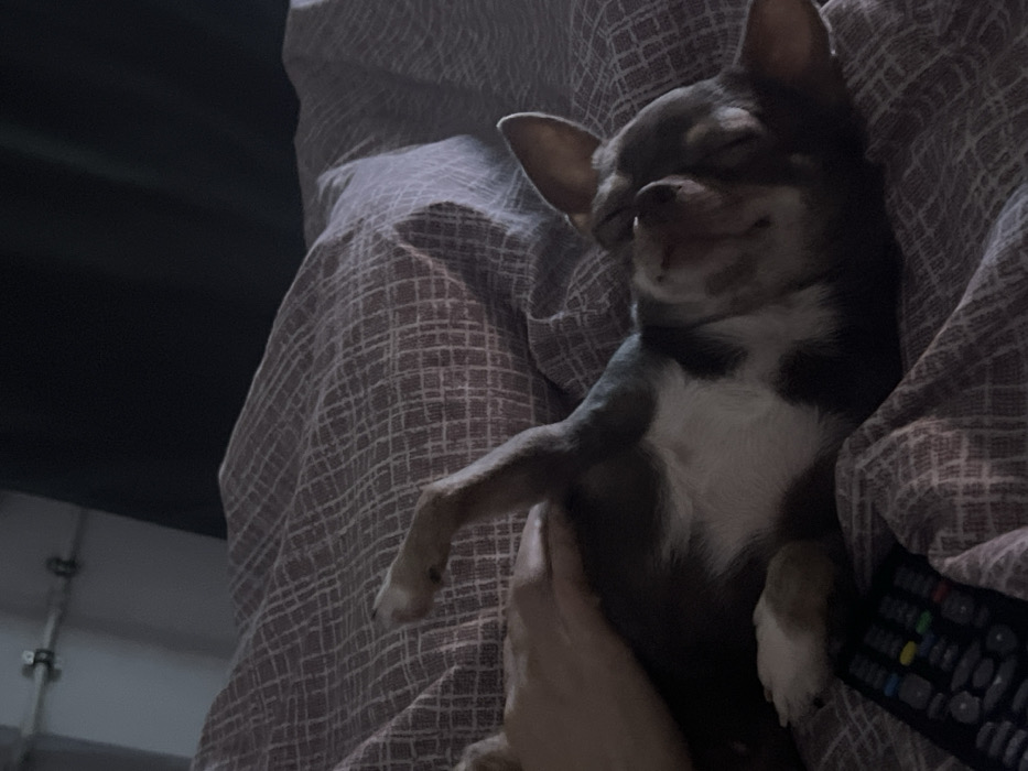 - "A chihuahua with dark brown and white fur is sleeping peacefully in someone's lap" by FM-6LnVy2, licensed under CC BY 4.0