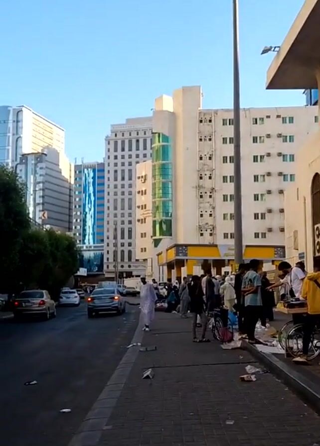 The video depicts a street scene in a city with tall buildings. On the right side of the street, along the sidewalk, a group of people are gathered. Some are standing, and others are sitting or squatting on the ground. There is a bicycle among the group. Litter is visible on the sidewalk and the street. Cars are driving on the street in both directions. The sky is clear and blue.