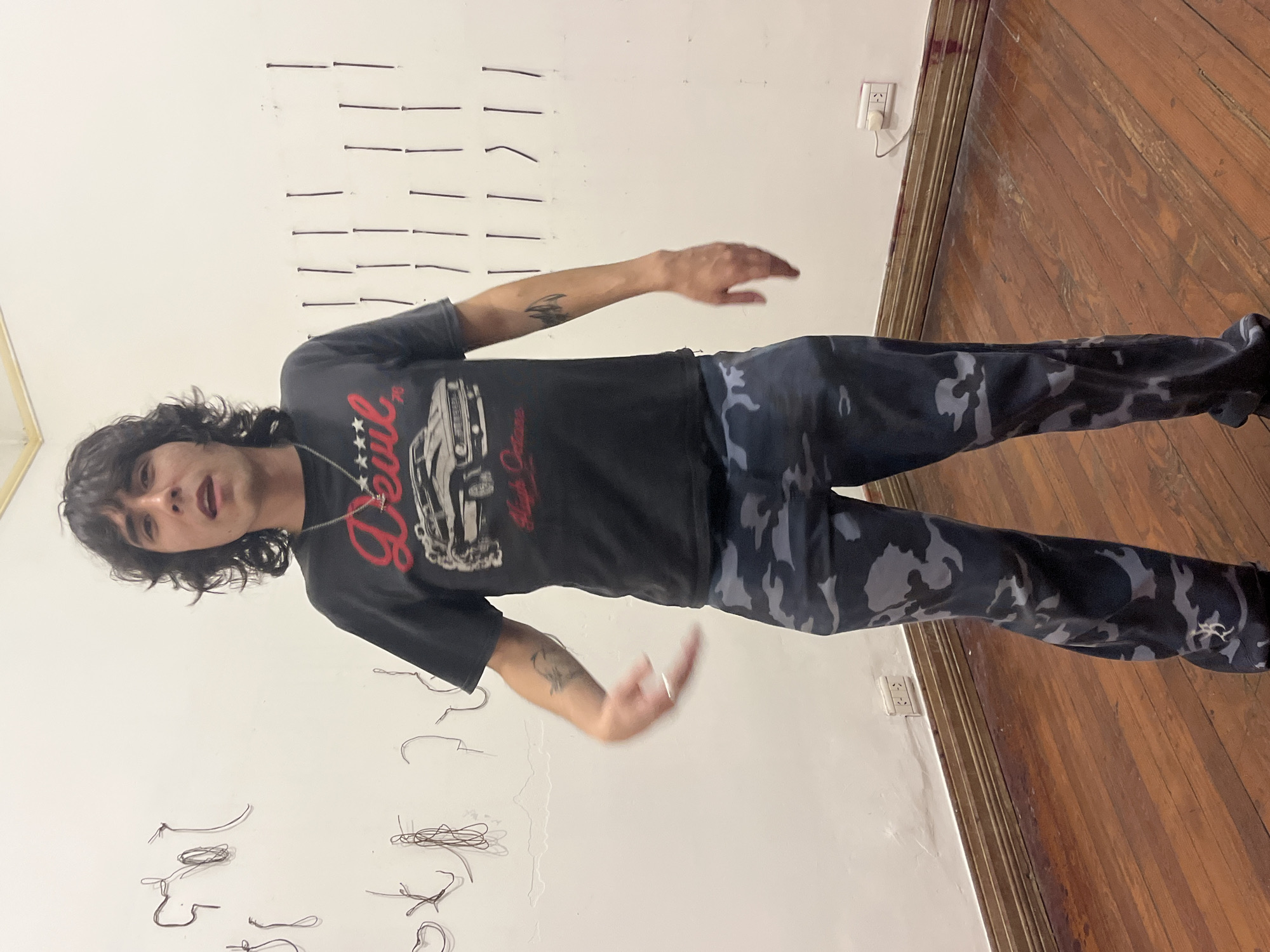 A young adult stands indoors against a white wall. The wall has wire art and a pattern of horizontal lines attached. The individual wears a black t-shirt with red writing and an image of a car, along with grey camouflage pants. The flooring is made of wooden planks. An electrical outlet is visible on the wall near the floor. The location is unknown.