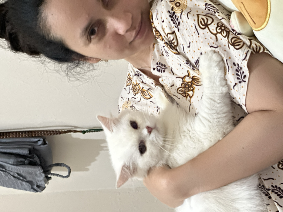 - "In Sidoarjo, Indonesia, a female individual is depicted indoors holding a white, long-haired cat" by FM-gujip2, licensed under CC BY 4.0