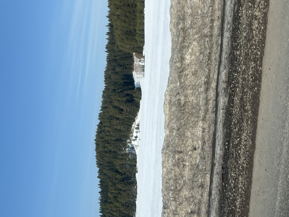 The image captures a vast winter landscape in Zura, Russia, under a clear blue sky with faint wispy clouds. In the immediate foreground, the edge of a road is visible, consisting of a narrow strip of dark grey asphalt, topped by a band of dark gravel and dirt. Above this, a substantial, dirty, brownish-grey snowbank, heavily textured, extends across the lower portion of the frame. Beyond the snowbank, the midground presents a wide, flat expanse of undisturbed white snow and ice, suggesting a frozen body of water or field. Towards the far edge of this snow-covered area, several smaller snow-covered mounds and a cluster of bare deciduous trees with thin branches are discernable. The background is dominated by a dense, dark green coniferous forest line stretching across the entire horizon, with some areas showing snow-covered ground beneath the trees. No individuals, animals, or specific actions are depicted in the scene.