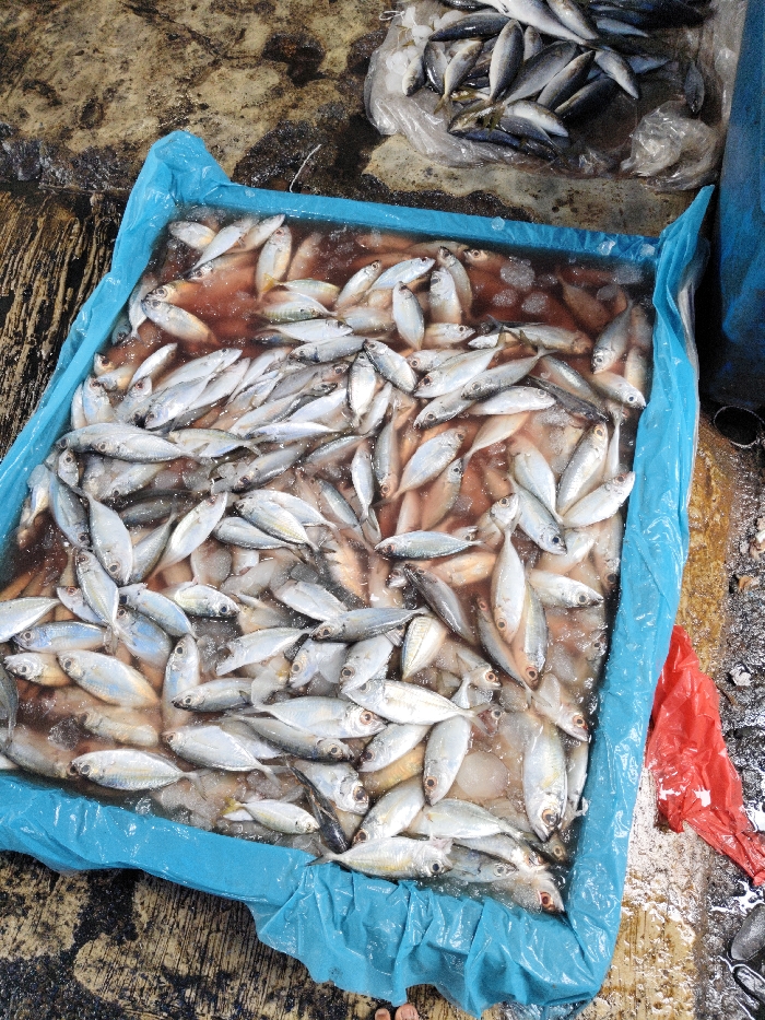 - "A rectangular blue plastic container filled with small silver fish on ice" by FM-bZrK33, licensed under CC BY 4.0