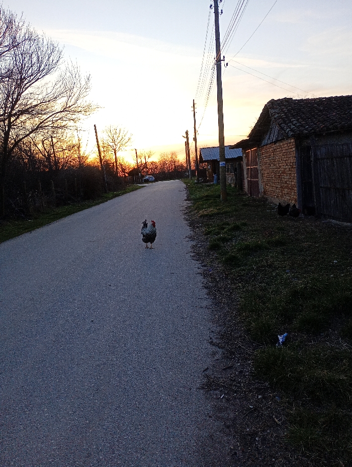 The image displays a rural road in Alfatar, Bulgaria, observed at dusk or sunset. A speckled grey and white rooster with a red comb stands centrally on a grey asphalt road, facing the viewer. To the right, a grassy verge accompanies a series of wooden utility poles with multiple overhead lines. Adjacent to the verge are two rustic buildings; the prominent one features a reddish-brown brick facade, a dark tiled roof, and a wooden door. Several dark-feathered chickens are visible on the ground near this building. To the left, a dense line of bare deciduous trees and brush is silhouetted against a bright orange and yellow horizon. Further down the road on the left, a light-colored vehicle is partially visible. A piece of white refuse is present on the grassy verge in the lower right foreground.