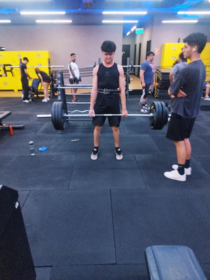 A gym shows several people engaged in various exercises. The focal point is a man in a black tank top and shorts, wearing a weightlifting belt, preparing to lift a barbell loaded with weights. Another man in a dark shirt and shorts stands to his right, observing. Other gym-goers can be seen in the background, using weight machines and interacting with each other. The gym has yellow lockers and blue overhead lighting.