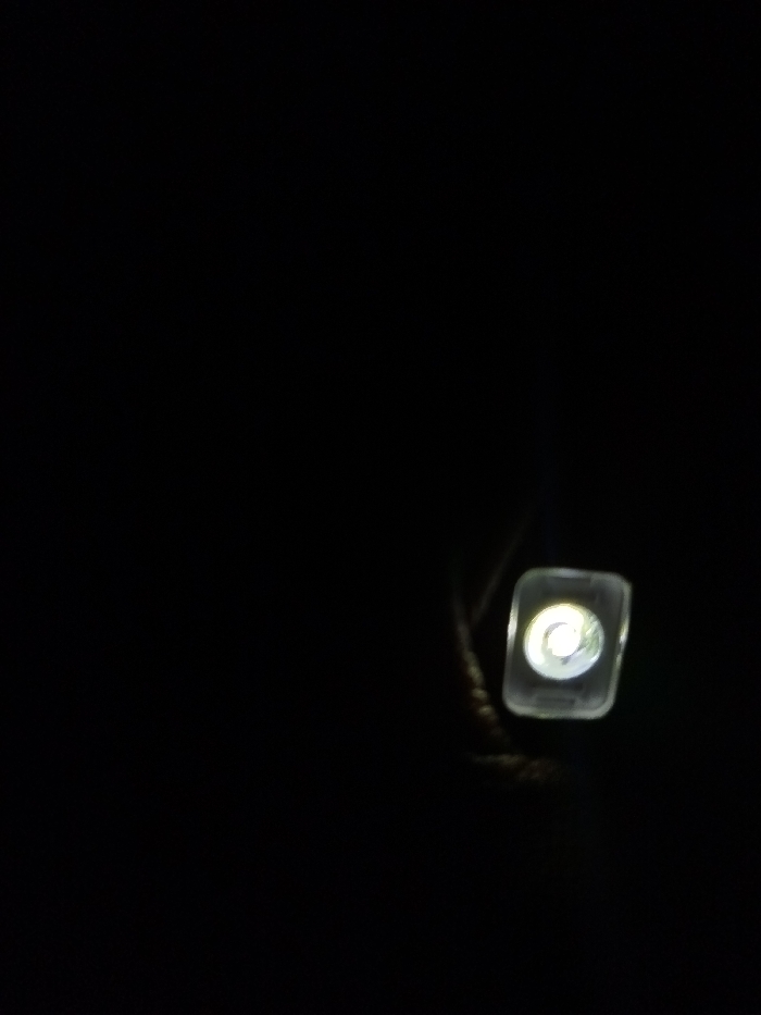 The image displays an extremely dark environment, with the majority of the frame rendered in deep black, indicative of minimal or absent ambient light. In the lower-right quadrant, a single, illuminated rectangular object is visible. This object features a prominent, circular, bright white light source at its center, which exhibits a subtle concentric or spiral pattern. The edges of the object appear somewhat soft, suggesting slight blur. Immediately adjacent to the illuminated object, a faint, dark, textured element is discernible, consistent with a braided cord or a coarse fabric. No other distinct subjects, objects, people, or actions are identifiable within the scene. The scene is located in Keffi, Nigeria.