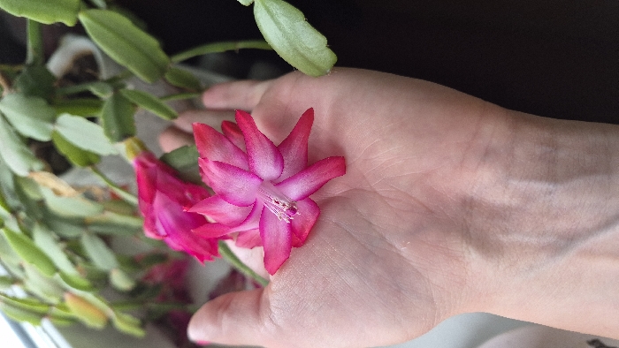 - "A light-skinned human hand, palm open, displays a single, vibrant pink and white Schlumbergera (Christmas cactus) flower" by FM-xjdxm2, licensed under CC BY 4.0