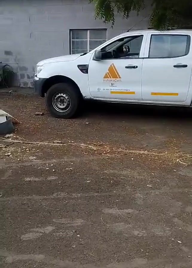 Here is a detailed description of the video: The video begins with a view of a white pickup truck with the logo of "AshakaCem" on its side