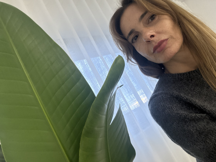 An adult female, characterized by light brown hair and a dark grey knitted sweater, occupies the right side of the frame, angled towards the viewer with a neutral expression. A large, broad-leafed green plant, consistent with a *Strelitzia* or banana plant, fills the left foreground. In the background, a window with white vertical blinds allows diffuse natural light to illuminate the interior space. The setting is an unidentifiable indoor location in the city of Unknown, Unknown. No specific actions or interactions beyond the subject's pose are depicted.