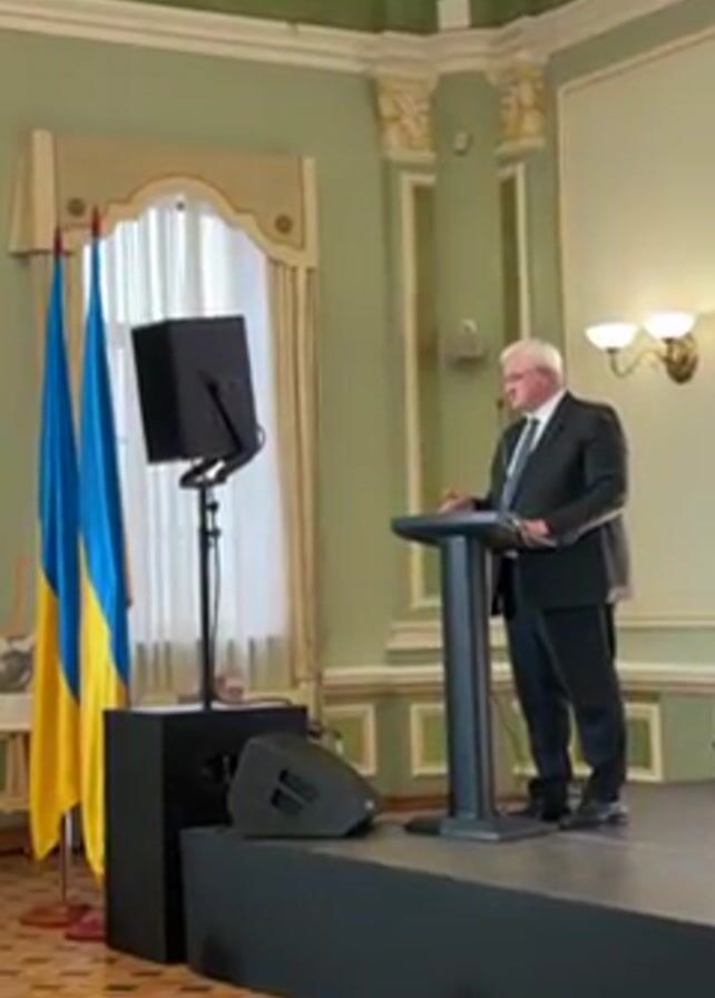 A man in a suit stands on a black platform at a podium in front of two Ukrainian flags. He appears to be reading from a document in his hand. Behind him is a large window with light-colored curtains. The walls are green and the floor is patterned. There are black speakers on the stage and a large black monitor stands nearby.