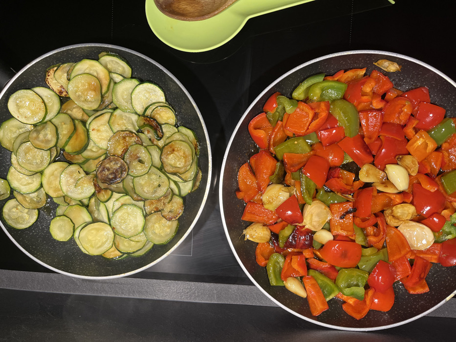 Two pans sit side-by-side on a black surface. The pan on the left contains thinly sliced zucchini rounds, some lightly browned. The pan on the right features chunks of red and green bell peppers, mixed with whole cloves of garlic. A lime-green spoon rest with a wooden spoon sits in the upper portion of the frame, above the pans. The composition suggests a cooking process in progress.