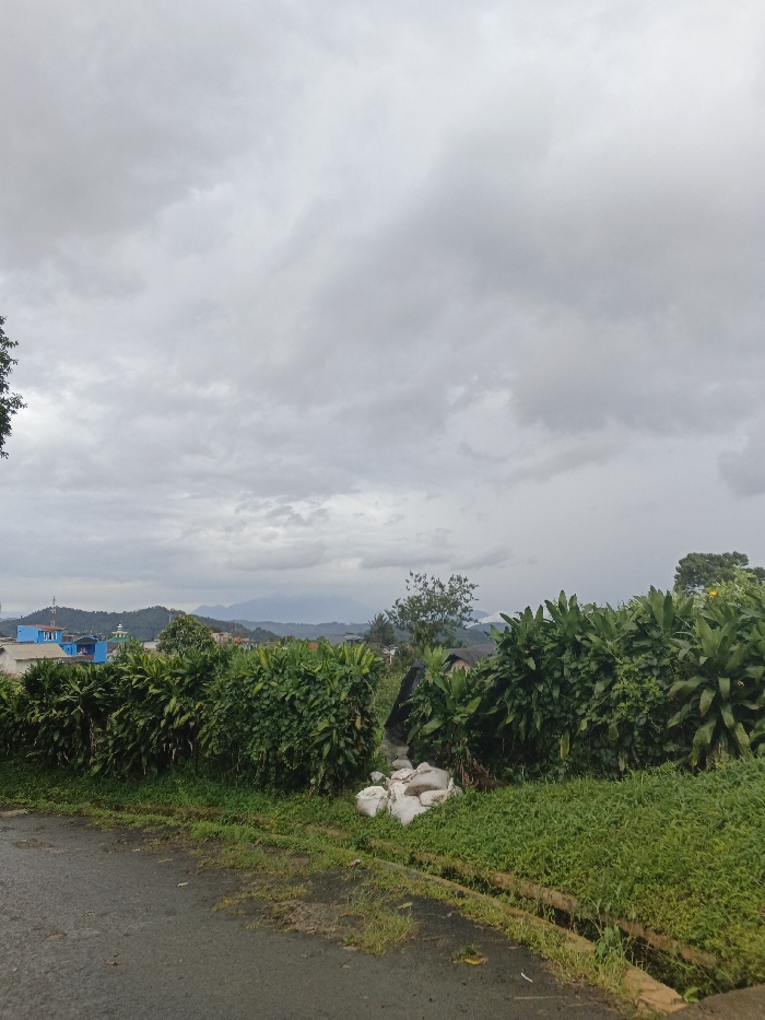 The image depicts an outdoor, rural-urban transition zone under an overcast, light-grey sky in the city of Unknown, Nepal. The foreground features a dark asphalt road on the left, adjacent to a green grass verge. A concrete drainage channel, partially filled with dark material, runs parallel to the road along the right side of the verge. A dense, dark green hedge of broad-leafed plants spans the midground horizontally. A clear break in the hedge, situated approximately two-thirds from the left edge of the frame, reveals a cluster of five to six white sacks piled on the ground, with additional dark, indeterminate debris visible behind them within the opening. Beyond the hedge, in the midground, residential-style buildings are discernible on the left, including one with a distinct blue roof and white walls. A small, green-domed structure, possibly part of a religious building, is visible near the center-left. Various green trees are scattered across the landscape. The background is dominated by a range of hazy mountains or hills stretching across the horizon, partially obscured by the extensive, heavy cloud cover that fills the upper two-thirds of the image. No individuals, specific actions, or interactions are visible within the scene.