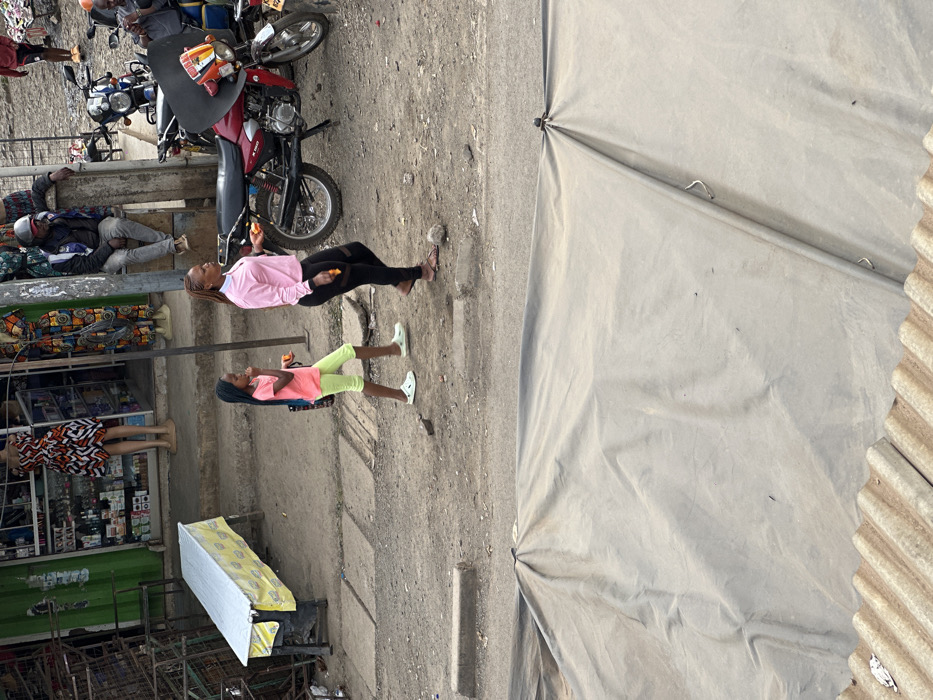 A street scene with two girls eating. The younger girl wears a pink shirt and neon green pants, while the older girl is in a pink jacket and black pants. Two motorcycles are parked nearby. A man sleeps against a wall. A shop with mannequins and displays is on the left. An off-white tarp covers part of the frame on the right, and metal roofing is visible at the very edge.
