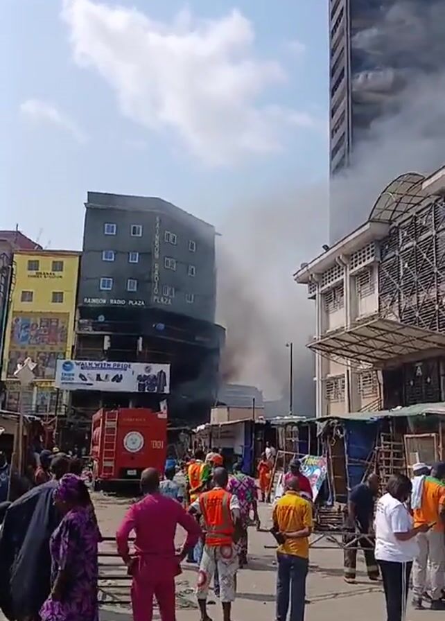 large fire in a tall building, with thick smoke billowing out. The building is surrounded by other buildings, and a crowd of people are watching from the street below. A fire truck is visible, but there is no indication of active firefighting efforts. The people are mostly standing around, some in orange vests and others in colorful clothing. The surrounding area appears to be a busy commercial district.