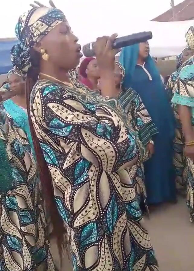 group of women, mostly wearing matching blue and beige leaf-patterned dresses and head coverings, standing outdoors. One woman, positioned prominently in the foreground, is speaking into a microphone and gesturing with her hands. Other women are standing around her, some wearing similar outfits. One woman is wearing a solid blue robe and head covering. The setting appears to be a gathering of some kind, possibly celebratory or ceremonial. The background is somewhat blurry, showing a house and a covered structure.