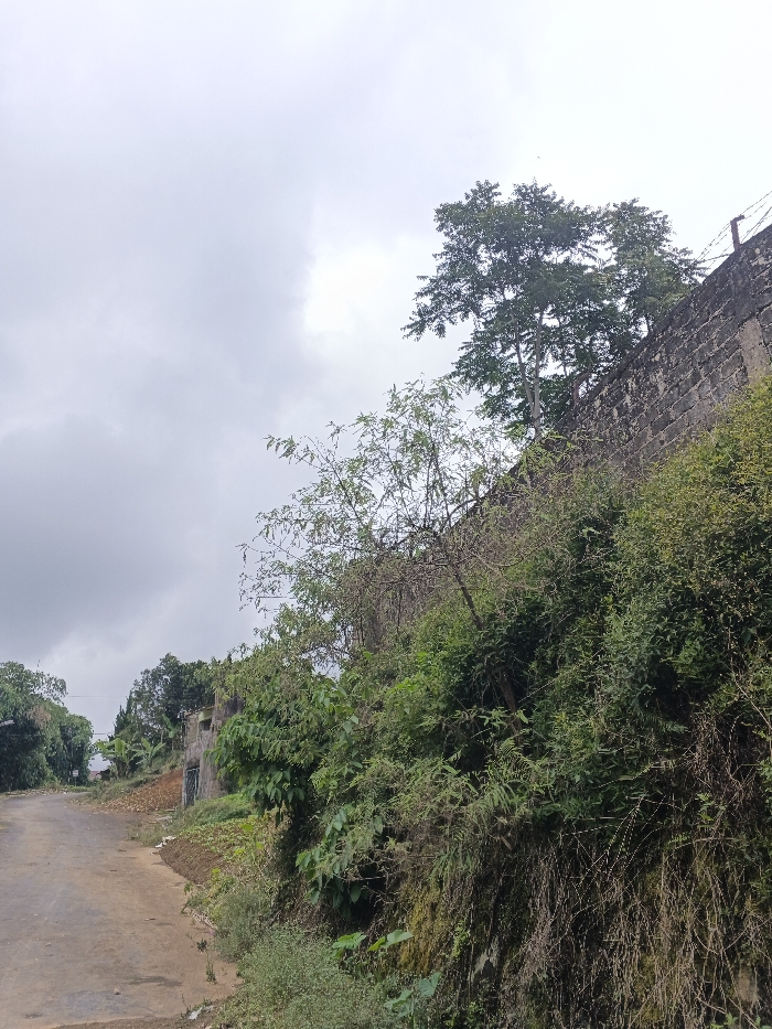 A narrow asphalt road curves to the left of the frame. Lush green vegetation covers a steep embankment to the right. Above, a tall brick wall topped with barbed wire rises, partially obscured by trees. The sky is overcast and grey, creating a somber atmosphere. In the distance, hints of buildings are visible through the foliage. The scene evokes a secluded, perhaps guarded, location.