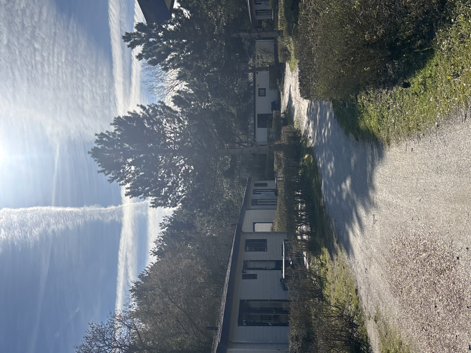 This image presents a sunny outdoor scene in what appears to be a holiday park or residential area within Bergen, Netherlands. The sky is light blue with scattered white, wispy clouds, and a bright sun is visible in the upper right, generating a lens flare. A distinct, white aircraft contrail forms a vertical line across the sky, intersected by a fainter horizontal contrail, creating a cross pattern. The foreground is dominated by a light-colored gravel or dirt path, which widens at the bottom of the frame and curves slightly to the right as it recedes into the midground. Shadows from unseen foliage are cast across the path. To the immediate left of the path stands a single-story chalet or bungalow, painted a light color (possibly off-white or light gray) with dark-framed windows and doors. This structure features prominent glass doors opening onto a small patio area, where a dark-colored outdoor table and two chairs are present. A low, trimmed hedge delineates the property line of this chalet. Further down the path, additional similar chalets are visible on both sides. The landscape is heavily vegetated with numerous tall pine trees (conifers) distributed throughout the scene, casting long shadows. Deciduous trees with bare branches are visible in the background, suggesting late winter or early spring. Patches of green grass and areas of exposed earth are present alongside the path and around the chalets, interspersed with various shrubs and hedges. No individuals, animals, or active human interactions are depicted in the scene; it appears unoccupied and still.