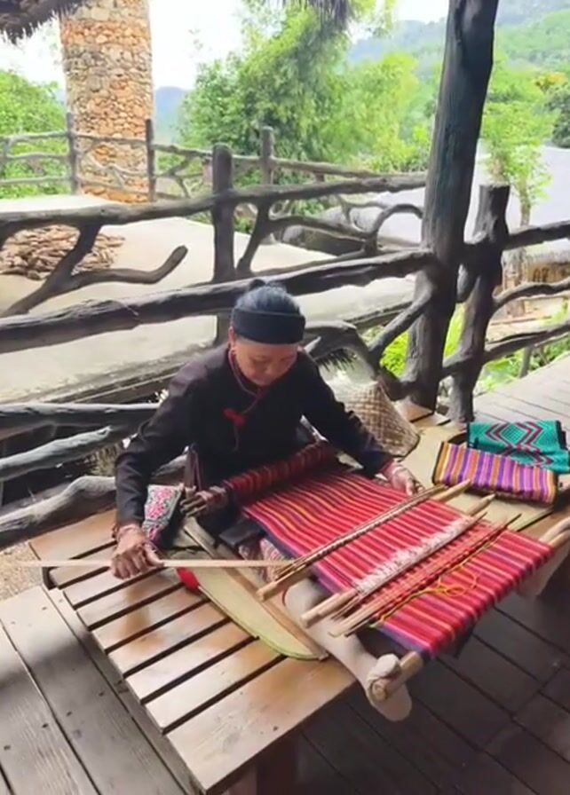 A woman is seated at a wooden table outdoors, engaged in the process of weaving. She's wearing a dark, long-sleeved garment and a dark head covering. The weaving loom is positioned on the table in front of her, displaying colorful threads of red, pink, and purple. She uses a wooden tool to weave the threads. To the right of the loom are finished woven items, also displaying similar vibrant colors and patterns. The table is part of a wooden structure, possibly a balcony or veranda, supported by thick wooden posts. The railing is made of rough-hewn branches, adding a rustic aesthetic. Beyond the railing, there's a lush, green landscape with trees and hills visible. A stone tower-like structure can be seen in the distance to the left. The overall setting suggests a rural or mountainous environment.