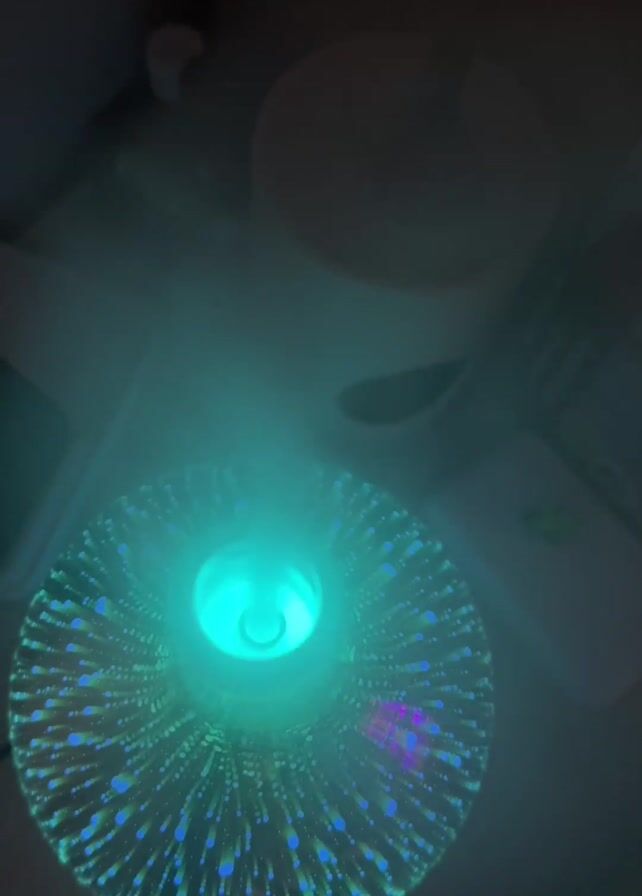humidifier, viewed from above, emitting mist into the air. The humidifier has a colorful, textured glass body that is illuminated by changing light. The light cycles through shades of green, blue, purple, pink, and white. Other objects are visible on a surface around the humidifier, but they are not in focus. The humidifier seems to be in operation.