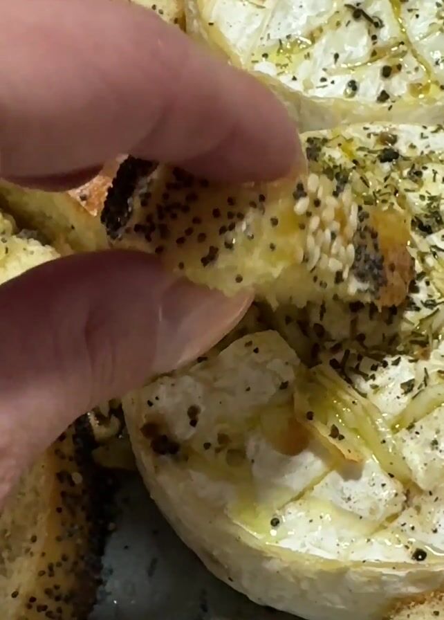 A close-up shot shows a hand dipping a piece of toasted bread into melted cheese. The cheese is round and covered with herbs, possibly rosemary or thyme. The toasted bread is garnished with seeds. The background includes more bread and cheese, all presented on a light blue surface. The scene suggests a snack or appetizer.