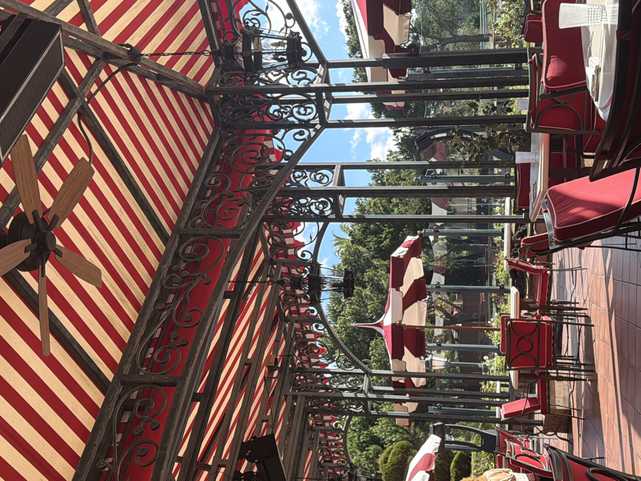 - "The image depicts a restaurant patio with a striped red and white awning, supported by ornate black metalwork" by FM-xVMMl2, licensed under CC BY 4.0