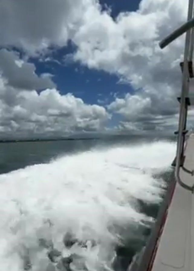 side of a boat moving quickly across water. The water is dark in the distance but white with foam and spray near the boat. The sky is blue with many puffy white clouds. A metal ladder and railing are attached to the side of the boat visible on the right side of the frame.