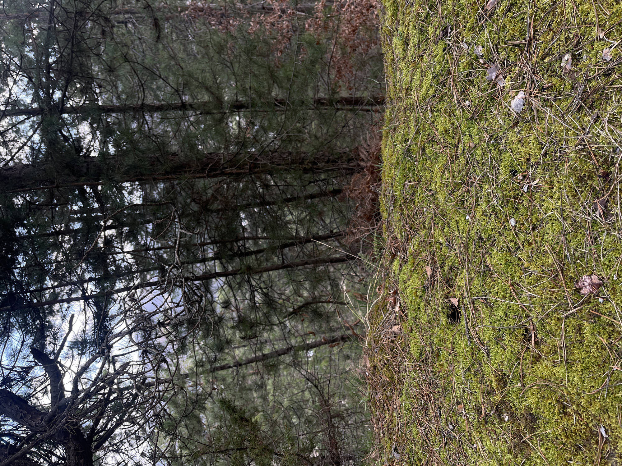 The image captures a forested landscape in Srednogortsi, Bulgaria. The foreground consists of a horizontal plane covered by dense, vibrant green moss, intermingled with numerous scattered brown pine needles, small twigs, and desiccated leaves. This moss-covered area extends from the bottom of the frame to approximately one-third of the image height. Beyond this foreground, the terrain descends into a dense coniferous forest. Numerous tall, dark-green pine trees with vertical trunks and full needle coverage occupy the midground and background, creating a thick canopy. A prominent, older tree with extensive bare, gnarled branches extends into the upper left portion of the frame. Through gaps in the tree canopy, sections of a bright, overcast or partly cloudy sky are visible. No human or animal subjects, specific actions, or interactions are present within the scene.
