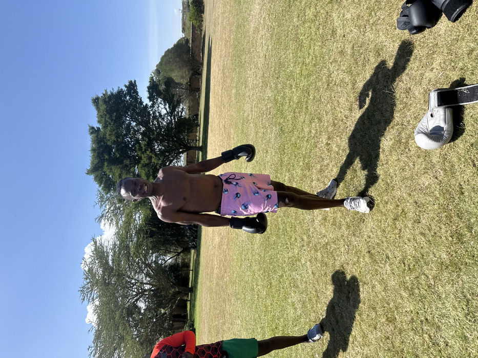 The image captures an outdoor scene in Olkaria ward, Kenya, under a clear blue sky with scattered white clouds. The setting is a large, manicured grassy field with green and some dry patches. In the foreground and center, a dark-skinned adult male stands facing the camera, smiling. He is shirtless, wearing pink shorts with a light blue jellyfish pattern, black boxing gloves on both hands, and grey athletic shoes. To his left, partially visible at the image's edge, is another dark-skinned adult male, wearing a red and black patterned long-sleeved shirt, green shorts, and grey athletic shoes. On the ground in the immediate foreground, a grey boxing glove with a black strap and a partially visible black boxing glove are present. The background features several large, green trees, including Acacia species, and a low, light-colored stone wall or fence stretching across the mid-ground. Strong sunlight casts distinct shadows of the individuals and objects onto the grass.