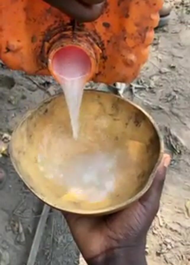 A close-up shot shows a pair of dark-skinned hands holding a gourd. A white, opaque liquid is being poured from an orange jerrycan into the gourd. The jerrycan is dirty and shows signs of wear. The gourd is yellow-brown in color and has a rough texture. The ground underneath is a mixture of dirt and sand with some small pieces of wood visible. A person wearing brown shoes is partially visible in the background.