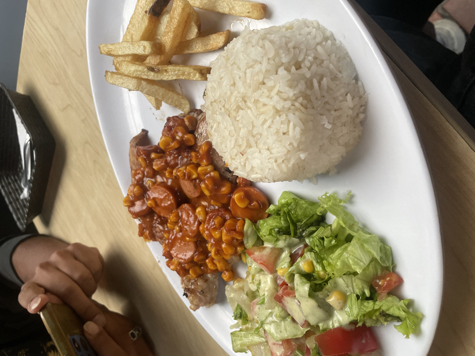 A white oval plate holds a meal featuring a mound of white rice, a generous portion of steak covered in a savory topping of sliced sausages and corn, and a side salad with lettuce and tomatoes. Adjacent to the rice are a few golden-brown french fries. A hand holding a phone is visible at the bottom left corner of the plate. The plate rests on a wooden table.