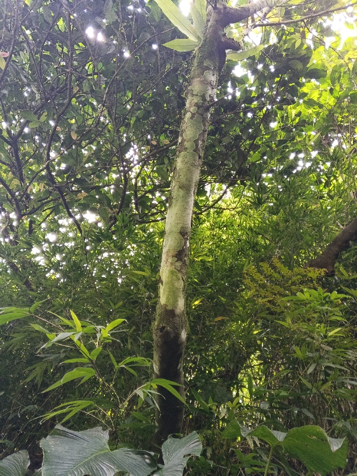 The image depicts a dense, tropical forest environment within Soibada, East Timor. A prominent, light-barked tree trunk with dark, mossy patches runs vertically through the right half of the frame. Its branches extend upwards, obscured by a thick canopy of various green foliage. Sunlight penetrates the canopy from above, creating bright, scattered highlights and lens flares through the leaves, indicating an overhead light source. Below the main canopy, layers of diverse green plants are visible, including what appears to be bamboo-like stalks and large, broad-leaved plants at the bottom of the frame. No individuals, animals, or man-made objects are present. The scene is static, capturing a natural, vibrant, and undisturbed forest landscape.