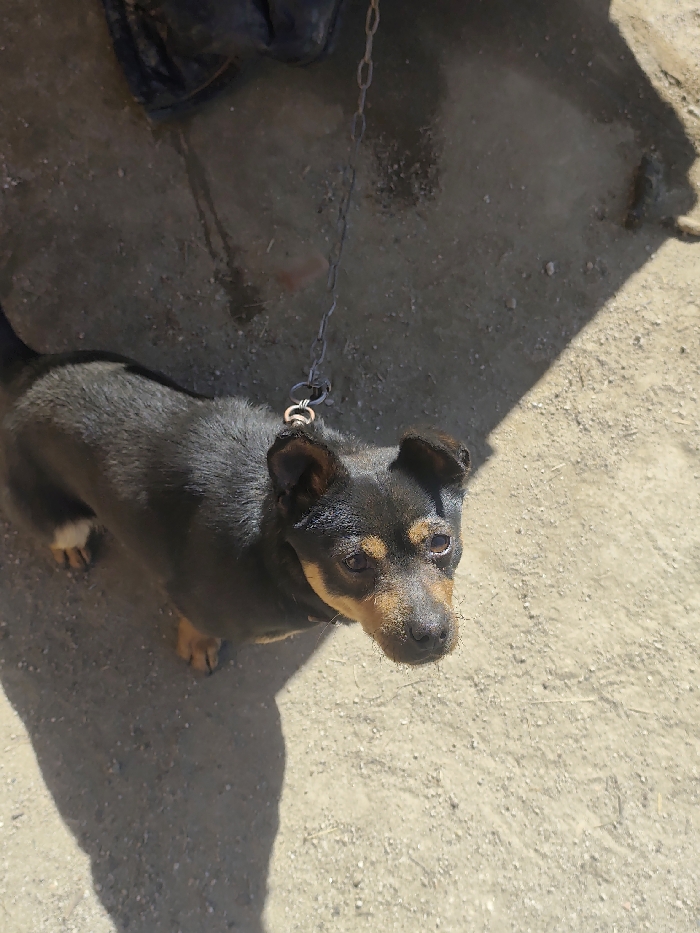 - "A small, black dog with tan markings on its muzzle, eyebrows, chest, and legs, is depicted standing outdoors on a dry, light brown/grey dirt surface with scattered small pebbles" by FM-3kNat1, licensed under CC BY 4.0