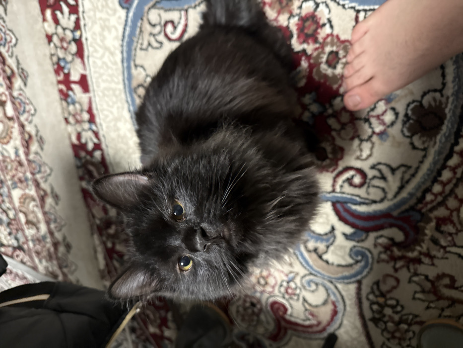 A fluffy, long-haired black cat stares upward, its golden eyes shining