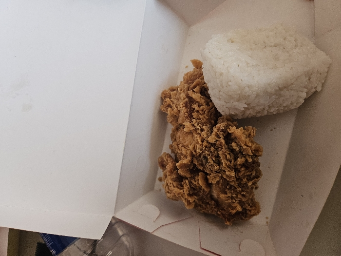 - "The image presents a close-up view of two pieces of golden-brown, crispy fried chicken alongside a compact, rectangular block of white rice, all contained within an open white cardboard takeout box" by FM-GNqsv2, licensed under CC BY 4.0