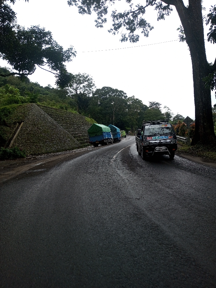 The image depicts a curved, wet asphalt road in Kamji Na-Yekha, Bhutan, under an overcast sky. On the left side of the road, a tiered retaining wall made of dark grey stones or gabions supports a steep, densely forested hillside. Two blue flatbed trucks with green tarpaulin covers are parked sequentially on the left shoulder of the road, positioned against the retaining wall and facing away from the camera. A black pickup truck, featuring a chrome bull bar and roof rack, is driving towards the viewer on the right side of the road; text, including "RELA TRANS PRATAMA," is visible on its windshield. A large tree with dark bark and green foliage stands on the right, its branches extending into the upper frame. Further along the right side, a metal guardrail and a brown diamond-shaped warning sign are visible. The background consists of numerous green trees and dense foliage, indicating a mountainous or heavily vegetated environment. No individuals are visible in the scene.
