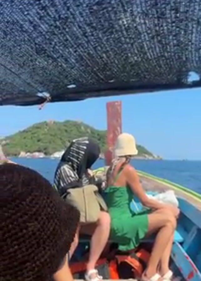 group of people on a boat traveling on the ocean on a sunny day. The boat has a makeshift shade roof. Several islands are visible in the distance. Passengers are adjusting their hair and taking photos with their phones. The boat is small and painted blue, with orange life vests visible.