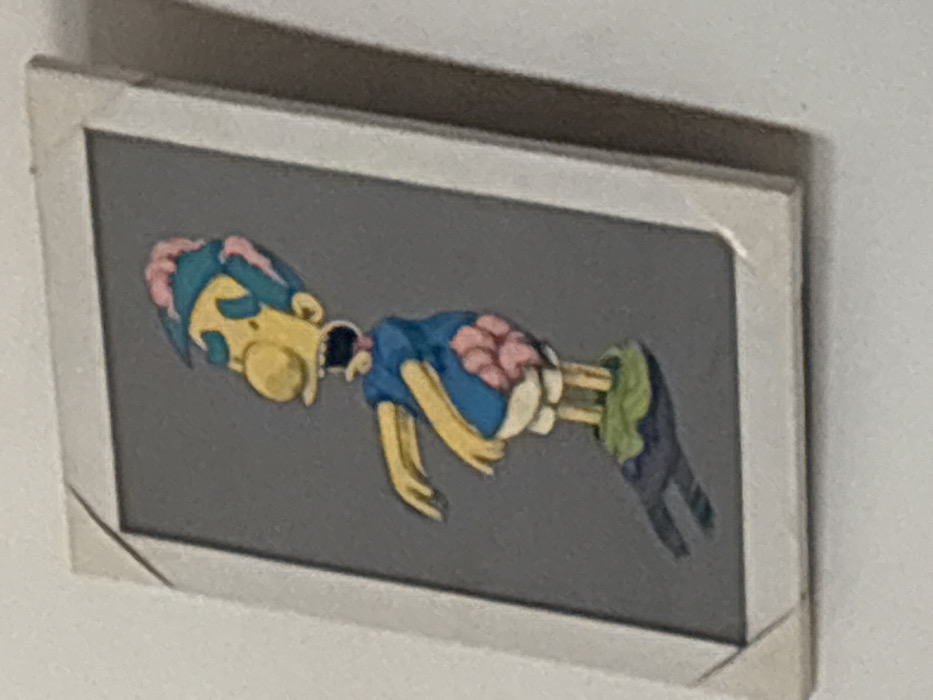 A vertically oriented, off-white framed picture is mounted on a light-colored wall in Tamaha, Nigeria. The image within the frame depicts a yellow-skinned cartoon character with a large nose, an open mouth, and blue hair. Pink, textured, brain-like tissue is visible on its head and protruding from its midsection, below a short-sleeved blue shirt. The character wears white shorts, stands on a green, irregular surface, and casts a prominent dark shadow to its left. Its arms are bent at the elbows and extended forward, consistent with a zombie-like posture. The background within the frame is a solid medium-grey. The frame itself appears to have a decorative or structural element on its upper left corner.