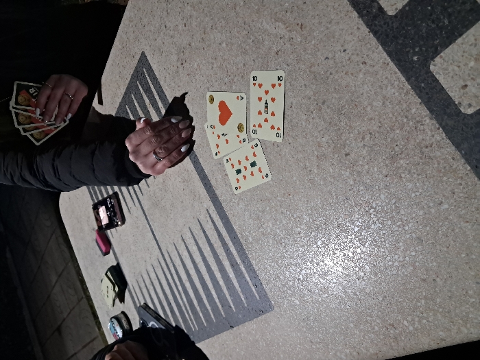 The scene captures a nighttime outdoor card game in the city of Pernik, Bulgaria