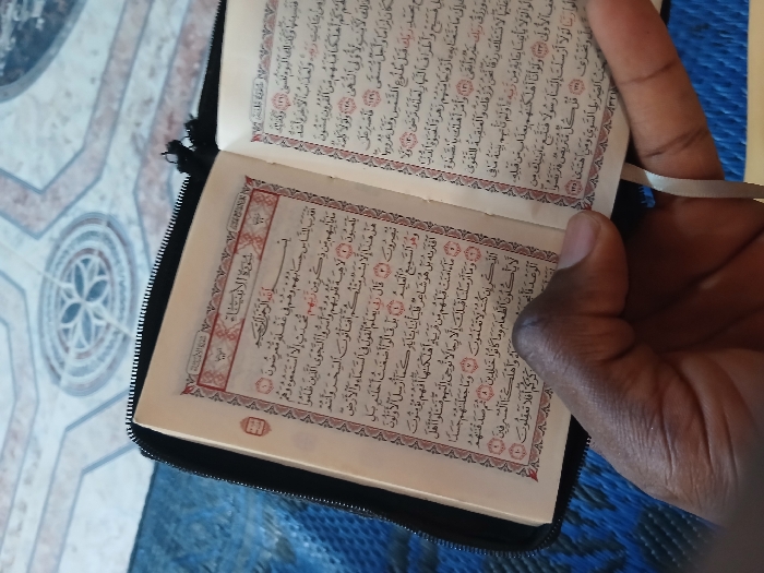 A dark-skinned right hand holds an open, small-sized Quran, displaying Arabic script with red decorative borders on cream-colored pages