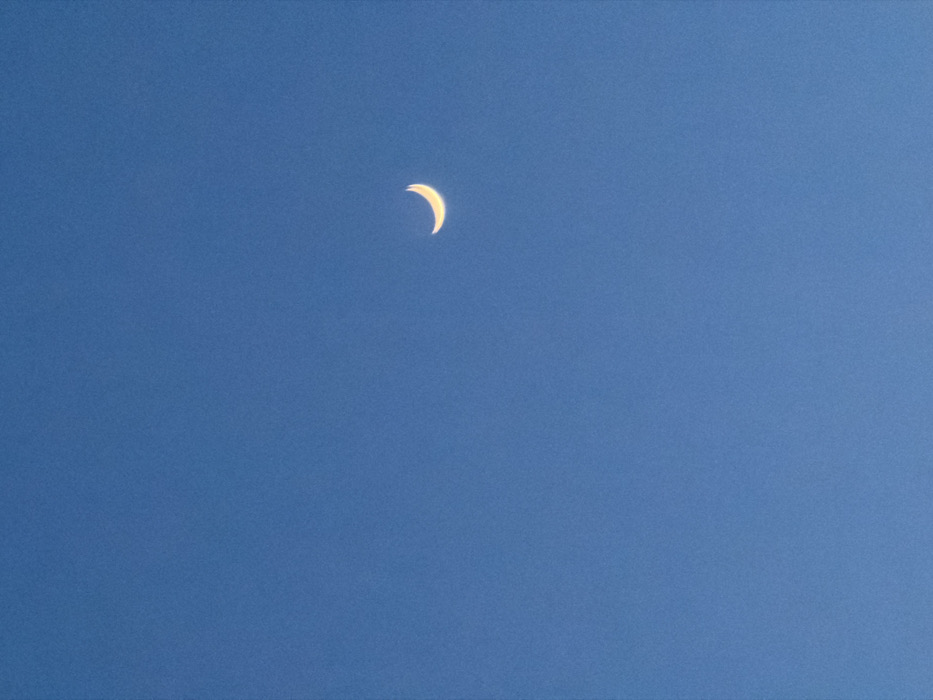 The image displays a clear, consistent mid-blue sky, observed from Connah's Quay, United Kingdom. Positioned in the upper-right quadrant of the frame is a distinctly illuminated crescent moon, exhibiting a luminous yellow-gold coloration. No other celestial bodies, atmospheric phenomena, terrestrial objects, structures, individuals, or discernible actions or interactions are present within the frame. The environment is solely atmospheric, depicting the sky and a singular celestial object.