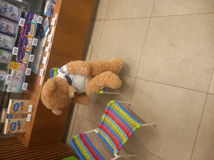 The scene depicts an indoor retail setting, identified as a location in Antwerp, Belgium. A large, brown, plush teddy bear, dressed in a white t-shirt with blue horizontal stripes, is seated on a small, white-framed chair featuring a woven plastic seat and back in blue, yellow, and white. The teddy bear's head is tilted forward and down, and its limbs hang loosely. To the left, a second, empty chair of identical design is partially visible, featuring a woven plastic seat and back in red, blue, green, and yellow. In the background, light-colored wooden shelves display various retail products, including Nestlé baby formula (visible brands include 'Nestlé Opvolgmelk' and 'NAN') and other packaged goods (e.g., 'Omron'), each accompanied by white rectangular price tags. The floor is composed of large, light-toned square tiles. The area is illuminated by overhead artificial lighting.