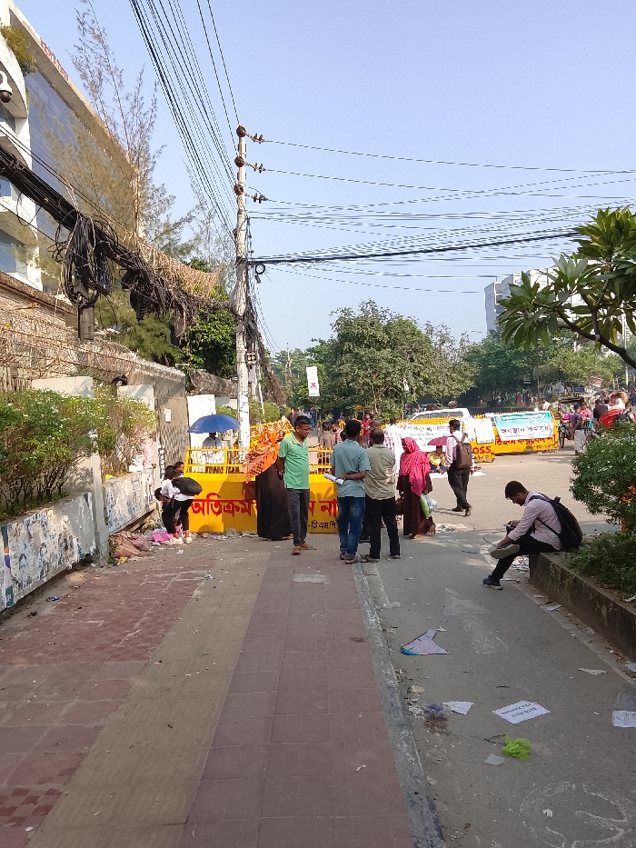 A bustling outdoor scene unfolds with pedestrians traversing a street cluttered with debris. People stand near a yellow barrier marked with text, possibly a checkpoint or gathering point. Overhead, a tangle of power lines crisscrosses the sky. A student sits on a low wall, seemingly absorbed in their phone. Buildings line the street, and trees dot the landscape, providing occasional shade in the bright daylight.