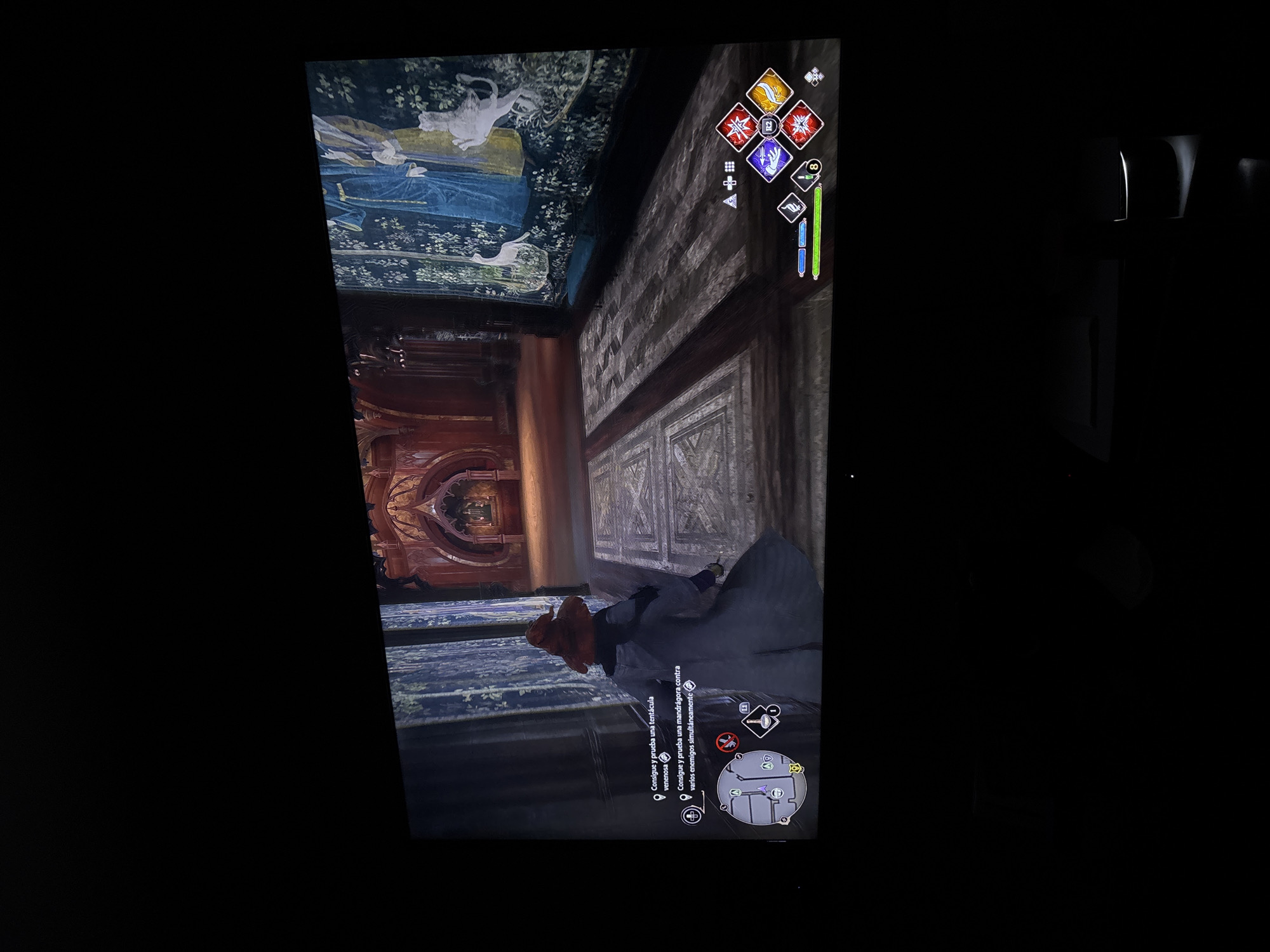 The image displays a brightly illuminated screen, likely a television or projector output, within a predominantly dark room in San Juan Cuautlancingo, Mexico. The screen occupies the central and upper portion of the frame, showing gameplay from the video game "Hogwarts Legacy." The in-game scene depicts a third-person perspective of a player character, clad in a dark robe and an orange pointed hat, navigating an ornate, dimly lit castle corridor. The corridor features a detailed patterned floor, textured walls resembling stone or aged wood, and intricate archways leading into the distance. On the right side of the screen, a large tapestry is visible, adorned with blue-robed figures and white mythical creatures against a dark, arboreal background. User interface elements are overlaid on the gameplay: * In the upper-left, two mission objectives are displayed in Spanish: "Consigue y prueba una tentáculo venenosa" (Get and try a venomous tentacula) and "Consigue y prueba una mandrágora contra varios enemigos simultáneamente" (Get and try a mandrake against several enemies simultaneously). * In the lower-left, a circular mini-map with various icons is present. * In the lower-right, a spell selection interface featuring multiple colored, diamond-shaped icons (red, blue, yellow) is visible, alongside a green health bar, a blue magic bar, and an icon with the number "8." Below the screen, in the physical environment, a white PlayStation 5 console is partially visible on a flat surface to the right. The rest of the physical surroundings are obscured by darkness.