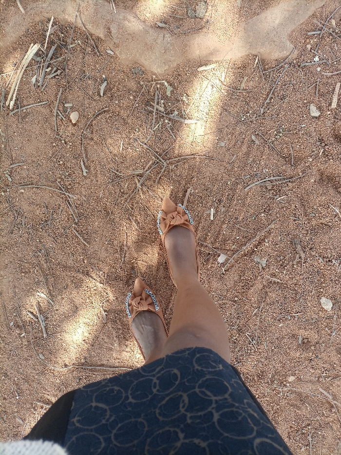 woman's legs and feet from a high angle. She wears light brown, pointed-toe shoes with a flower design and rhinestone embellishments. She is standing on a dirt ground covered in dry twigs and leaves. Her outfit includes a navy blue skirt with a light brown circle pattern. Sunlight streams through the trees casting shadows on the ground.