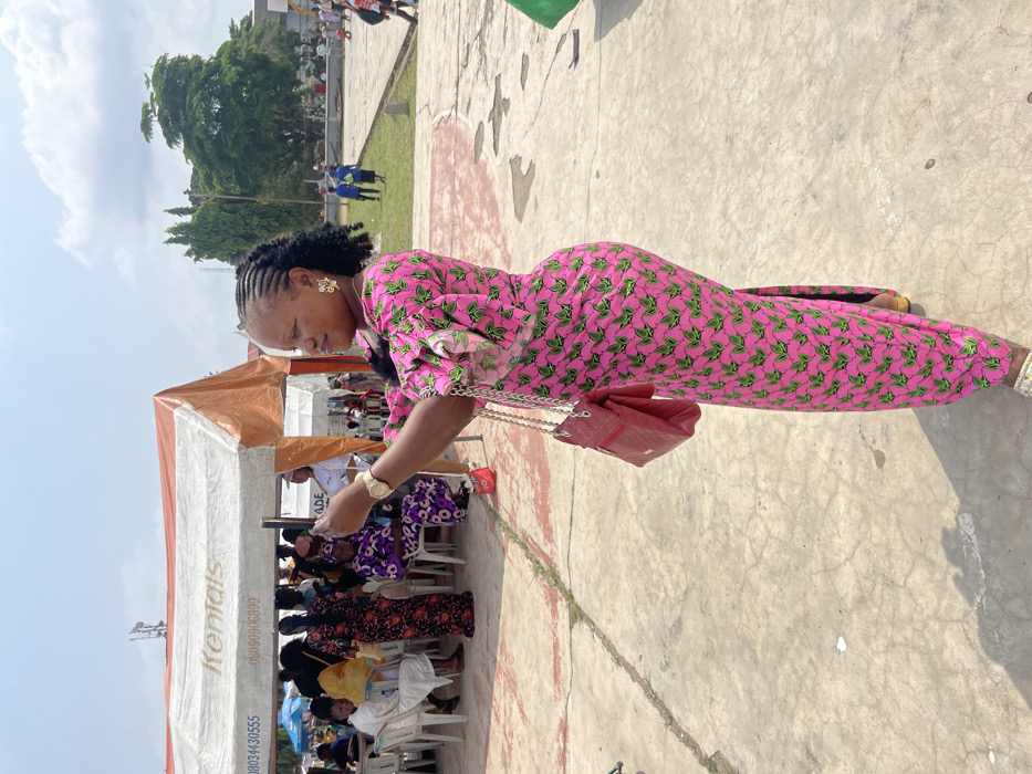 A daytime outdoor scene in Ebute-Metta, Nigeria, depicts an event under a partly cloudy sky