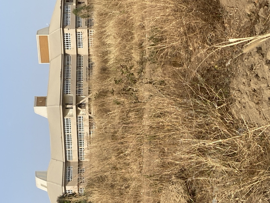 The image displays a multi-story building identified as being in Ban, Nigeria, situated beyond an expansive field of dry, tall, yellowish-brown grass. Patches of exposed light brown soil are visible in the foreground, along with a few sparse green plants among the dry vegetation. The building itself is light brown or tan, featuring a distinctive roofline with multiple angular, elevated structures. It possesses numerous uniformly spaced, white-framed rectangular windows across several floors. Dark-railed balconies are present on some levels, and visible structural supports appear to elevate parts of the building from its base. The sky above is clear and light blue. No individuals, actions, or specific interactions are discernible within the frame.