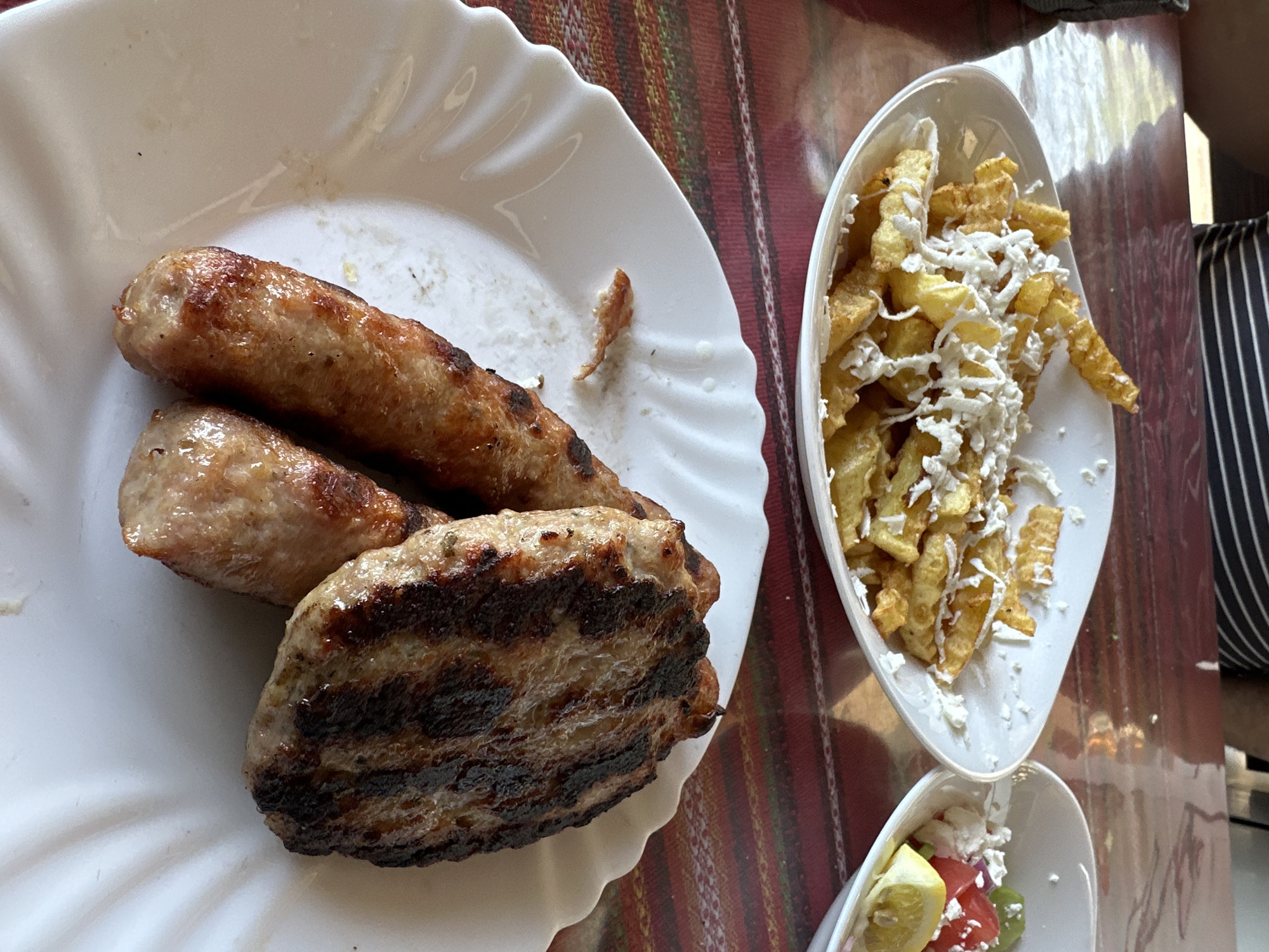 A tabletop scene shows a meal, likely in Kresna, Bulgaria, suggested by typical Bulgarian cuisine and surroundings. The setting appears to be either indoors or on a covered patio with a striped tablecloth. The food is arranged on two white plates and a small white bowl. Plate 1 (left): Two sausages and one meat patty, possibly a 'kyufte' (Bulgarian meatball), are arranged on the plate. The patty is distinctly grilled with visible sear marks. Plate 2 (top right): Contains french fries topped with shredded cheese. Small white bowl (bottom right): Visible salad featuring tomatoes, onions, and a lemon wedge, possibly Shopska salad. No people are directly visible, but a portion of a black and white striped garment suggests someone is seated at the table.