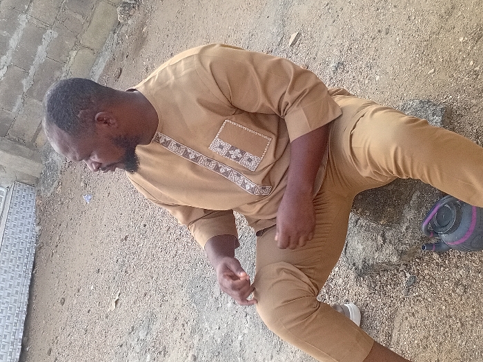 A man in a tan shirt and pants kneels on a dusty ground. He is looking down, seemingly focused on something near his hand. His attire suggests a formal or cultural outfit. A gray and purple object is positioned to his right. The background shows a wall-like structure, indicating an outdoor setting. The overall impression is of someone engaged in a quiet, personal activity.