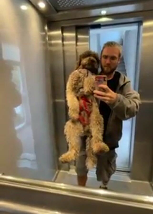 Inside a mirrored elevator, a man wearing glasses and a gray hoodie stands facing the mirror, holding a large, fluffy brown dog with a red harness