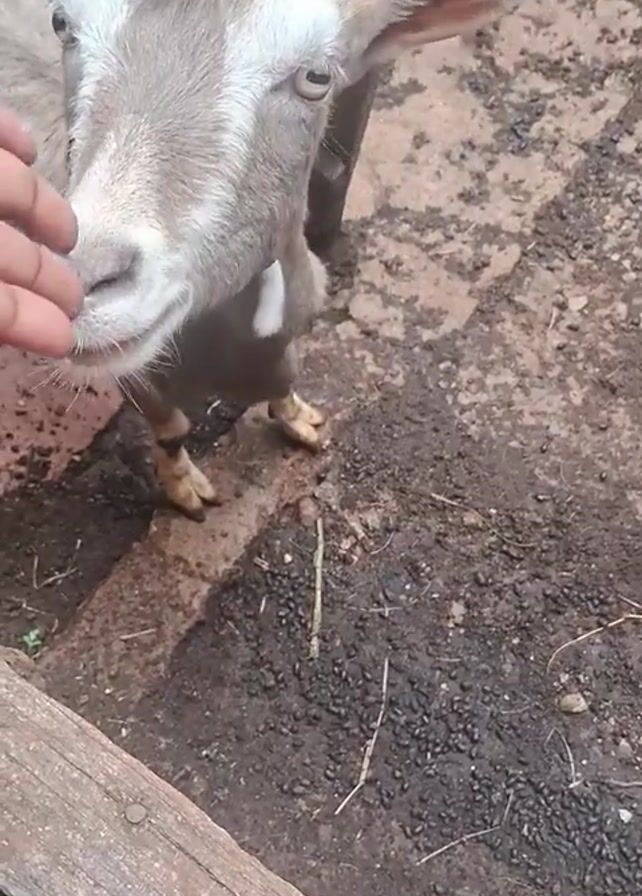 A goat stands in a dirt enclosure. A hand reaches out and touches the goat’s face. The goat chews. The ground is covered in dark pellets. A wooden plank is in the foreground.